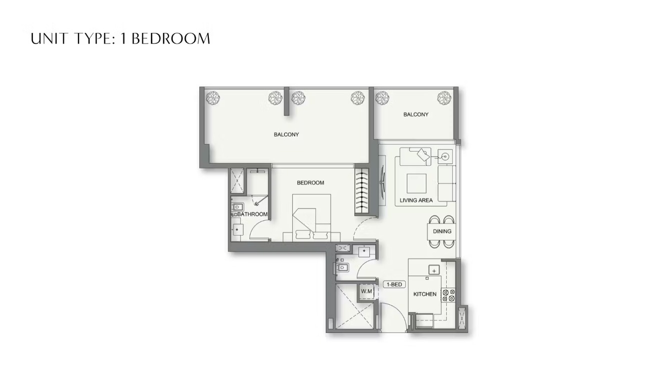 This well-planned 1-Bedroom apartment offers a comfortable and efficient layout suitable for modern living. The unit features a bright living and dining area connected to a functional kitchen, along with a private bedroom and a conveniently located bathroom. The apartment also includes two balconies — one attached to the living area and another with the bedroom — providing natural light, ventilation, and additional open space. Overall, the layout is designed to maximize usability while maintaining privacy and comfort.