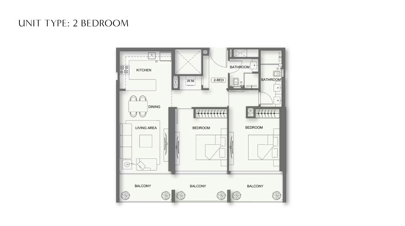 This well-designed 2-Bedroom apartment offers a spacious and comfortable layout suitable for families. The unit features a welcoming living area connected to a dining space and a functional kitchen, allowing smooth daily living and interaction. Both bedrooms are positioned to provide privacy, with easy access to two bathrooms for added convenience. A major highlight of the apartment is the extended balcony area accessible from the living room and bedrooms, ensuring ample natural light, ventilation, and outdoor relaxation space. The layout balances practicality and comfort, making it ideal for modern residential living.